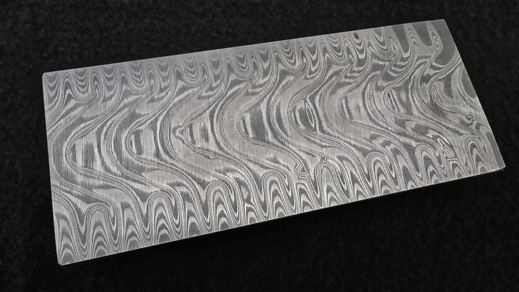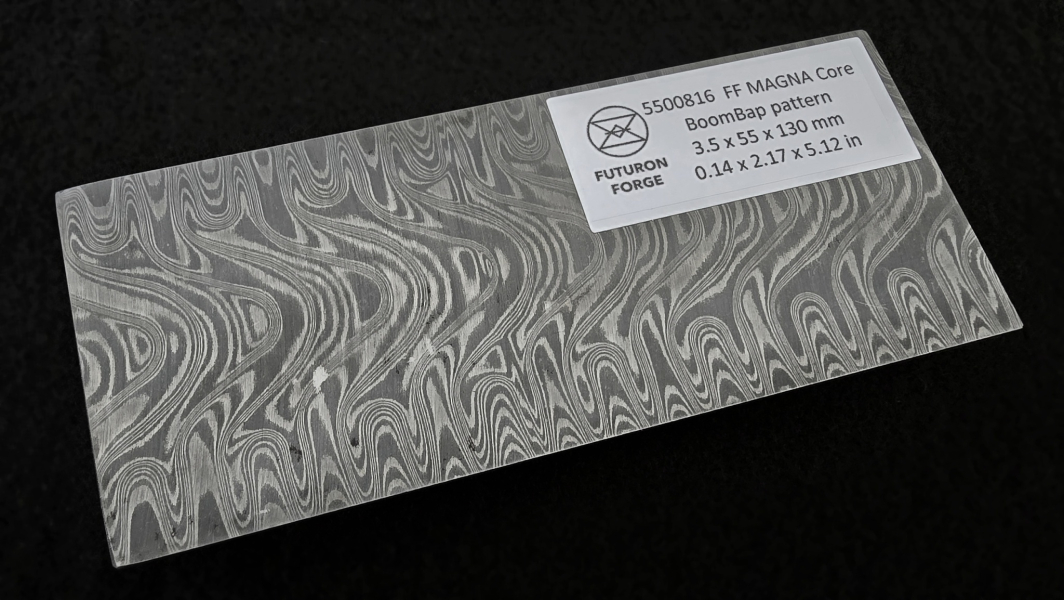 San-Mai layered MagnaCut core stainless damascus. Crucible MagnaCut is a groundbreaking American-made powder metallurgy stainless steel for knives. An excellent combination of toughness and wear resistance makes it a great choice for small folders, choppers, or kitchen knives. Composition of outer layers - AISI304 + AEB-L steel. Soft annealed. High contrast etching. Hardenable up to 62 HRc. Marking: "FF Magna core". Hashtags: #HardcoreFuturon #FFMAGNAcore