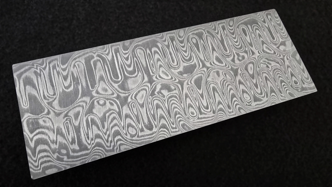 San-Mai layered Elmax core stainless damascus. Elmax Superclean (by Uddeholm) is powder steel with an excellent grain structure, providing great wear resistance, corrosion resistance, and dimensional stability. Best for knifemaking. Composition of outer layers - AISI304 + AEB-L steel. Soft annealed. High contrast etching. Hardenable up to 61 HRc. Marking: "FF ELMAX core". Hashtags: #HardcoreFuturon #FFELMAXcore #HardCOREfuturon
