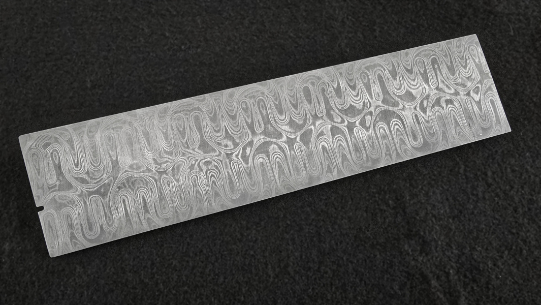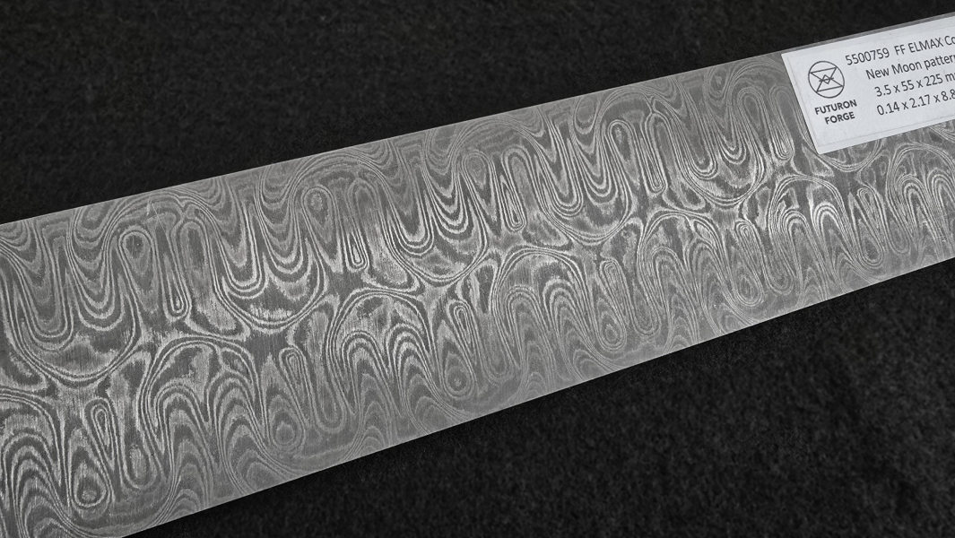 San-Mai layered Elmax core stainless damascus. Elmax Superclean (by Uddeholm) is powder steel with an excellent grain structure, providing great wear resistance, corrosion resistance, and dimensional stability. Best for knifemaking. Composition of outer layers - AISI304 + AEB-L steel. Soft annealed. High contrast etching. Hardenable up to 61 HRc. Marking: "FF ELMAX core". Hashtags: #HardcoreFuturon #FFELMAXcore #HardCOREfuturon