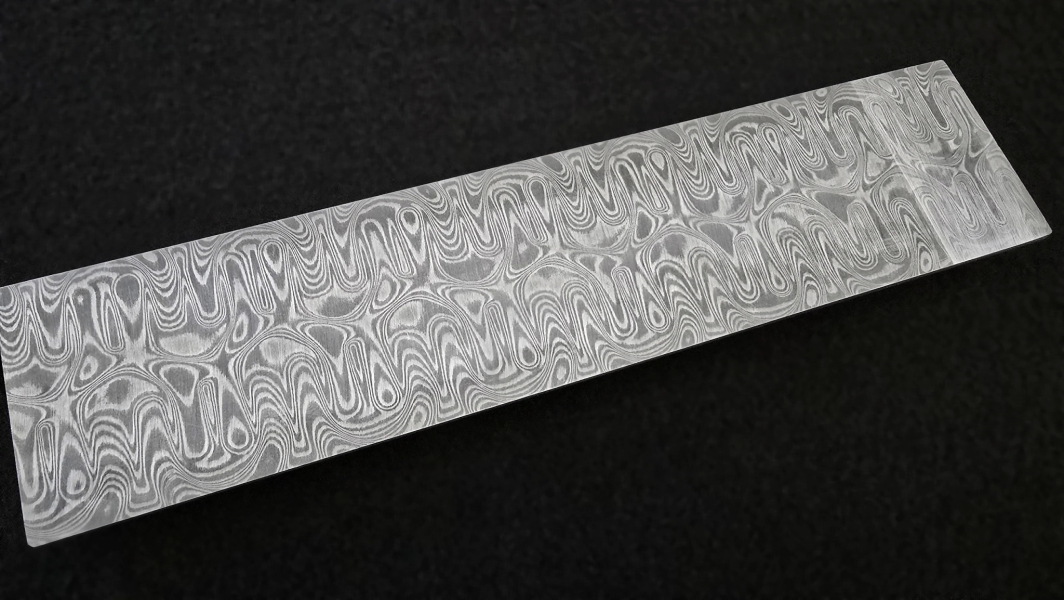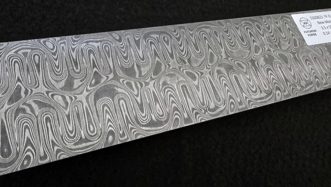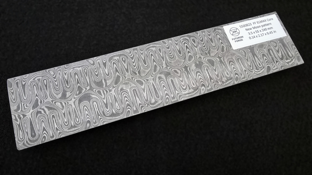 San-Mai layered MagnaCut core stainless damascus. Crucible MagnaCut is a groundbreaking American-made powder metallurgy stainless steel for knives. An excellent combination of toughness and wear resistance makes it a great choice for small folders, choppers, or kitchen knives. Composition of outer layers - AISI304 + AEB-L steel. Soft annealed. High contrast etching. Hardenable up to 62 HRc. Marking: "FF Magna core". Hashtags: #HardcoreFuturon #FFMAGNAcore