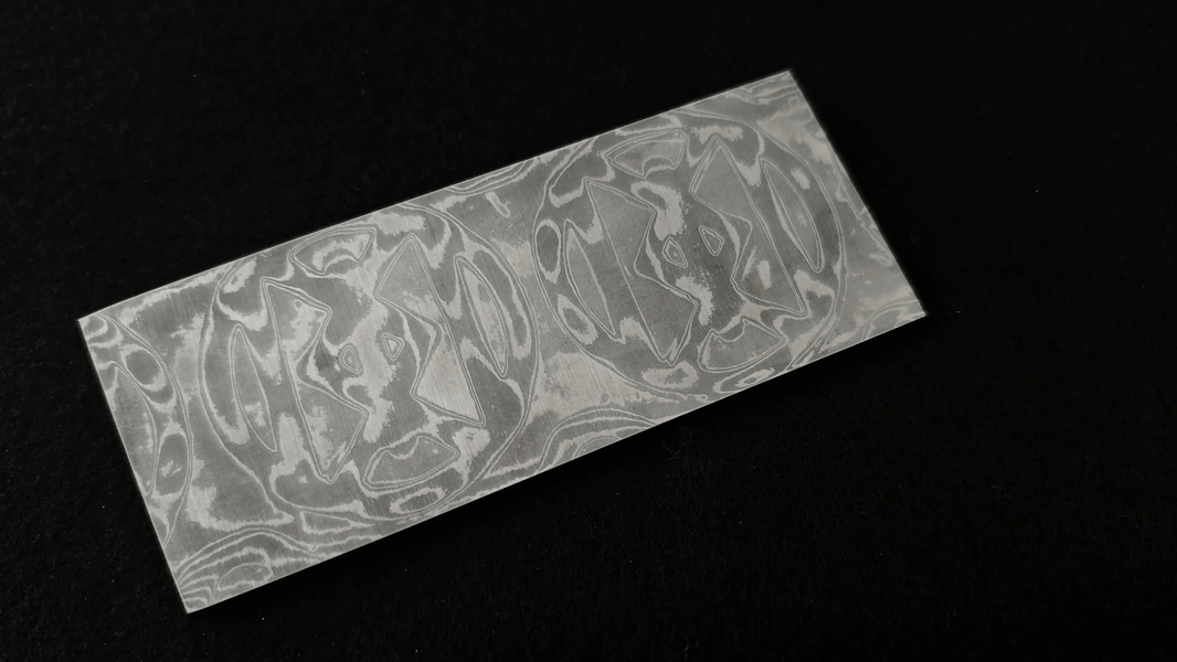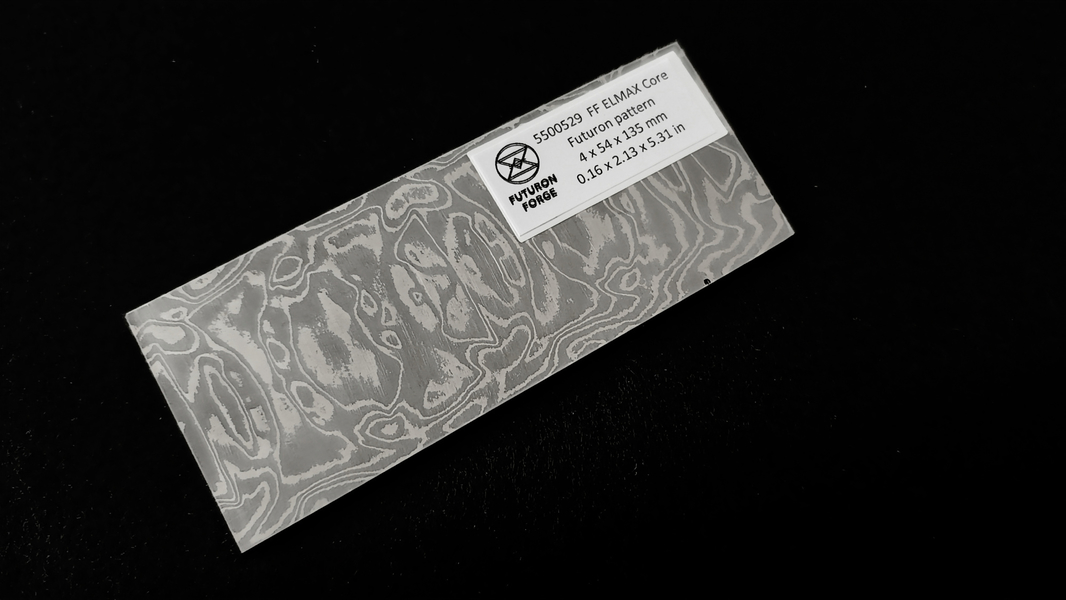 San-Mai layered Elmax core stainless damascus. Elmax Superclean (by Uddeholm) is powder steel with an excellent grain structure, providing great wear resistance, corrosion resistance, and dimensional stability. Best for knifemaking. Composition of outer layers - AISI304 + AEB-L steel. Soft annealed. High contrast etching. Hardenable up to 61 HRc. Marking: "FF ELMAX core". Hashtags: #HardcoreFuturon #FFELMAXcore #HardCOREfuturon