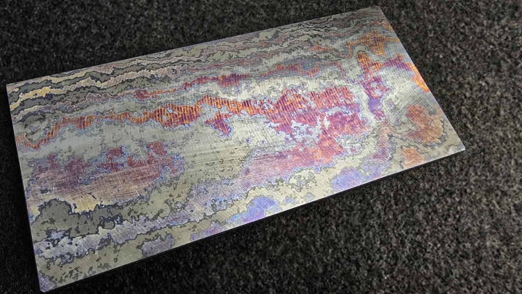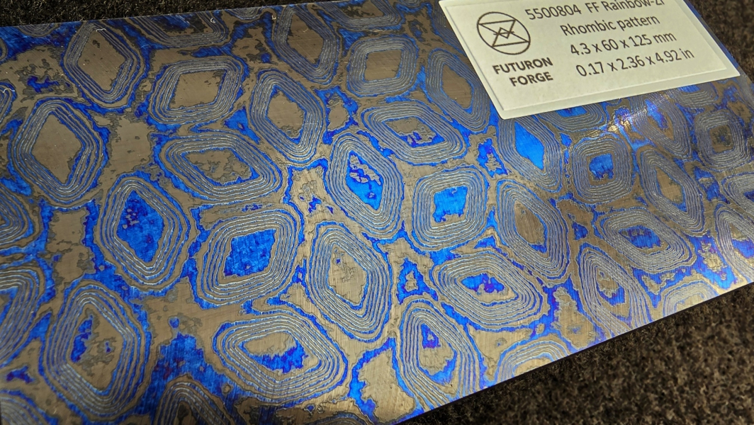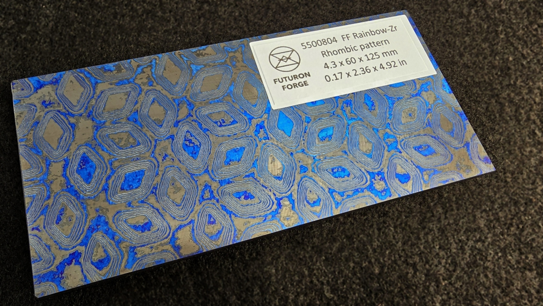 Composite of Zirconium and various Titanium grades (mainly Gr2, Gr5, Gr7, Gr9). Zirconium (Zr) is an extremely corrosion-resistant metal adding a black color (and its shades). You can reach different colors by electrochemical or heat oxidation. Each piece of produced material can be colored differently. It's suitable for knifemaking, jewelry applications, or watchmaking. The material is fully hypoallergenic. Marking: "FF Rainbow Zr". Hashtags: #RainbowFuturon #BlackFuturon #RainbowZ