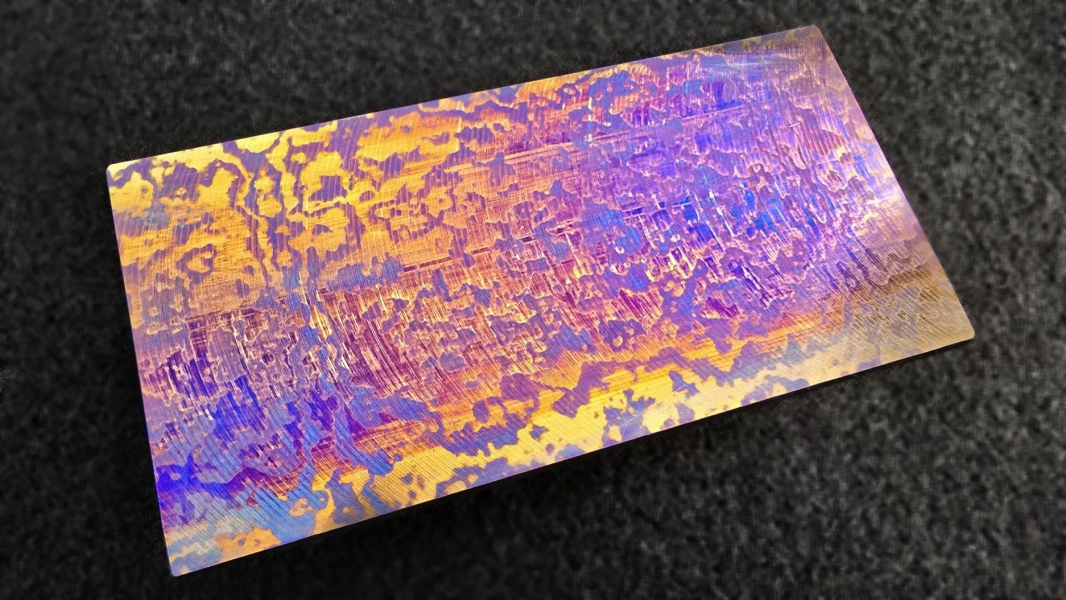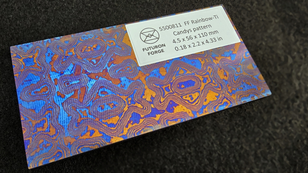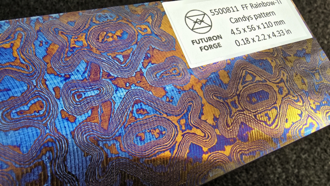 Composite of Zirconium and various Titanium grades (mainly Gr2, Gr5, Gr7, Gr9). Zirconium (Zr) is an extremely corrosion-resistant metal adding a black color (and its shades). You can reach different colors by electrochemical or heat oxidation. Each piece of produced material can be colored differently. It's suitable for knifemaking, jewelry applications, or watchmaking. The material is fully hypoallergenic. Marking: "FF Rainbow Zr". Hashtags: #RainbowFuturon #BlackFuturon #RainbowZ