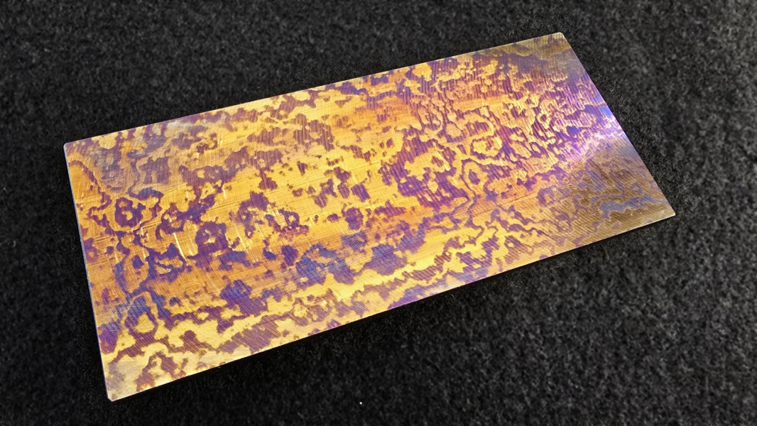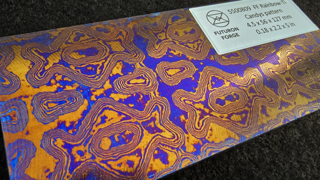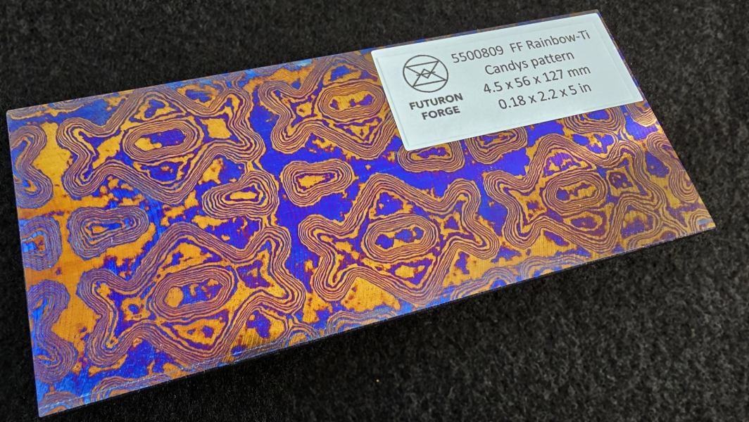 Composite of Zirconium and various Titanium grades (mainly Gr2, Gr5, Gr7, Gr9). Zirconium (Zr) is an extremely corrosion-resistant metal adding a black color (and its shades). You can reach different colors by electrochemical or heat oxidation. Each piece of produced material can be colored differently. It's suitable for knifemaking, jewelry applications, or watchmaking. The material is fully hypoallergenic. Marking: "FF Rainbow Zr". Hashtags: #RainbowFuturon #BlackFuturon #RainbowZ