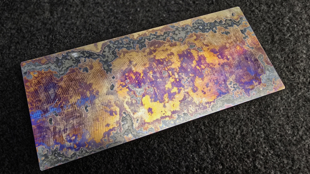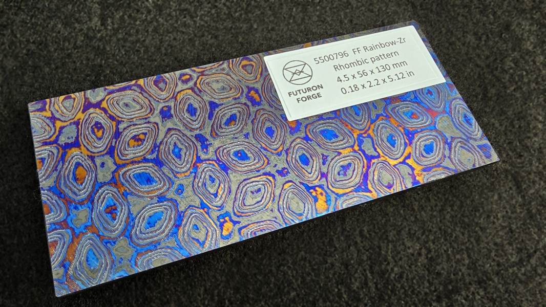 Composite of Zirconium and various Titanium grades (mainly Gr2, Gr5, Gr7, Gr9). Zirconium (Zr) is an extremely corrosion-resistant metal adding a black color (and its shades). You can reach different colors by electrochemical or heat oxidation. Each piece of produced material can be colored differently. It's suitable for knifemaking, jewelry applications, or watchmaking. The material is fully hypoallergenic. Marking: "FF Rainbow Zr". Hashtags: #RainbowFuturon #BlackFuturon #RainbowZ