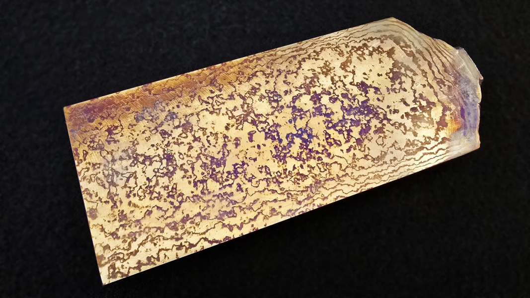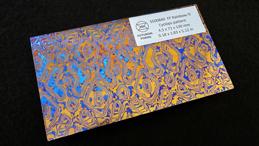 Composite of various Titanium grades (mainly Gr2, Gr5, Gr7, Gr9). You can reach different colors by electro-chemical or heat oxidation. Each piece of material can be colored differently. It's suitable for knifemaking, jewelry applications, or watchmaking. The material is lightweight and fully hypoallergenic. Marking: "FF Rainbow Ti". Hashtags: #RainbowFuturon #RainbowTi