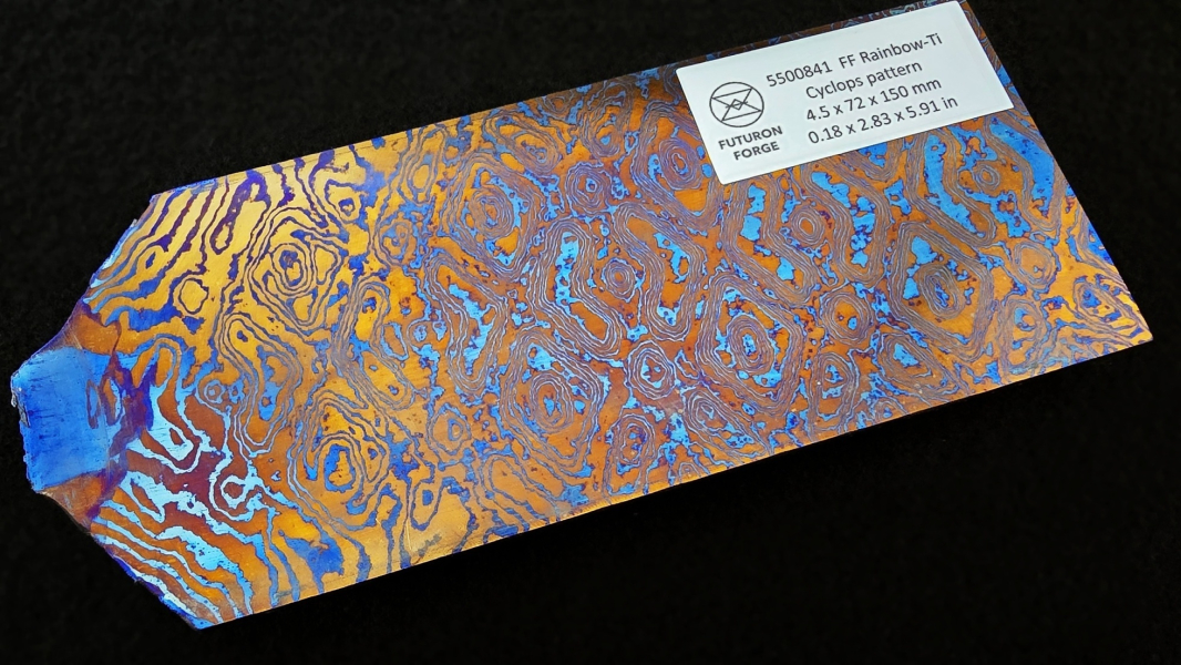 Composite of various Titanium grades (mainly Gr2, Gr5, Gr7, Gr9). You can reach different colors by electro-chemical or heat oxidation. Each piece of material can be colored differently. It's suitable for knifemaking, jewelry applications, or watchmaking. The material is lightweight and fully hypoallergenic. Marking: "FF Rainbow Ti". Hashtags: #RainbowFuturon #RainbowTi