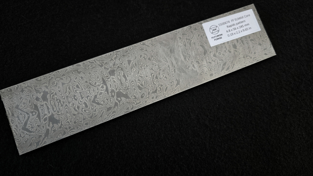 San-Mai layered Elmax core stainless damascus. Elmax Superclean (by Uddeholm) is powder steel with an excellent grain structure, providing great wear resistance, corrosion resistance, and dimensional stability. Best for knifemaking. Composition of outer layers - AISI304 + AEB-L steel. Soft annealed. High contrast etching. Hardenable up to 61 HRc. Marking: "FF ELMAX core". Hashtags: #HardcoreFuturon #FFELMAXcore #HardCOREfuturon